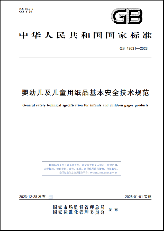 GB 43631—2023《嬰幼兒及兒童用紙品基本安全技術(shù)規(guī)范》強(qiáng)制性國(guó)家標(biāo)準(zhǔn)的研制,提升嬰幼兒及兒童用紙制消費(fèi)品的質(zhì)量安全標(biāo)準(zhǔn)水平,既保障了嬰幼兒及兒童的健康安全,同時(shí)也符合國(guó)家相關(guān)政策精神。