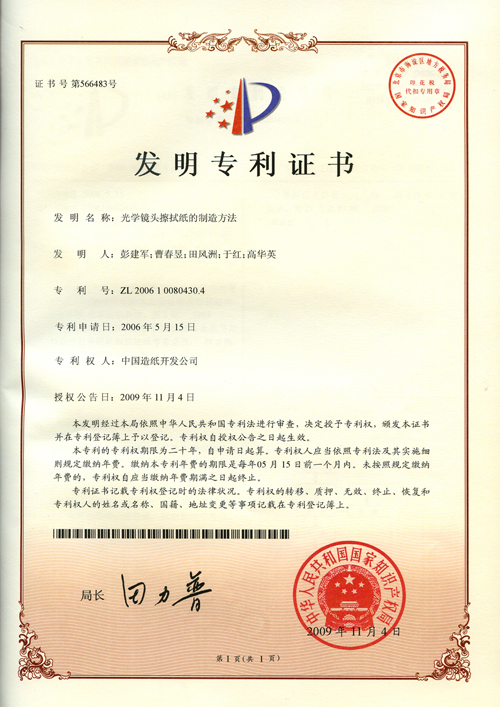 由中國制漿造紙研究院申請(qǐng)的兩項(xiàng)發(fā)明專利“光學(xué)鏡頭擦拭紙的制造方法”和“全熱空氣換熱器紙芯用隔離紙的制造技術(shù)”于11月4日獲得國家知識(shí)產(chǎn)權(quán)局專利授權(quán)。
