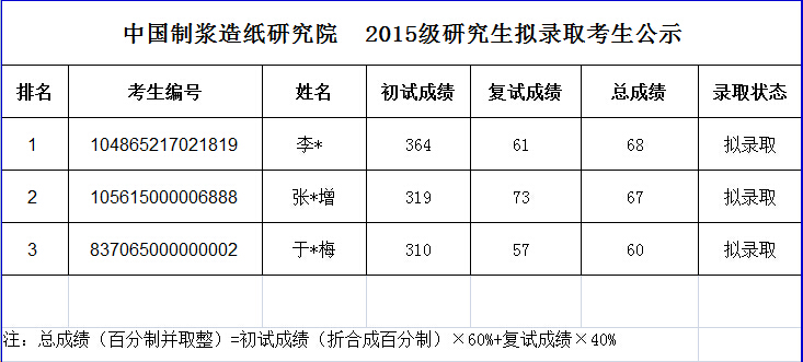 中國制漿造紙研究院2015級研究生擬錄取考生公示