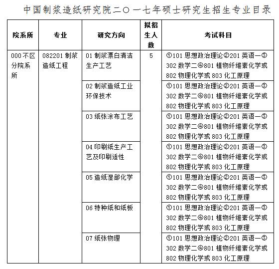 ? ?中國制漿造紙研究院面向全國招生,2017年計劃招收碩士學位研究生5名。