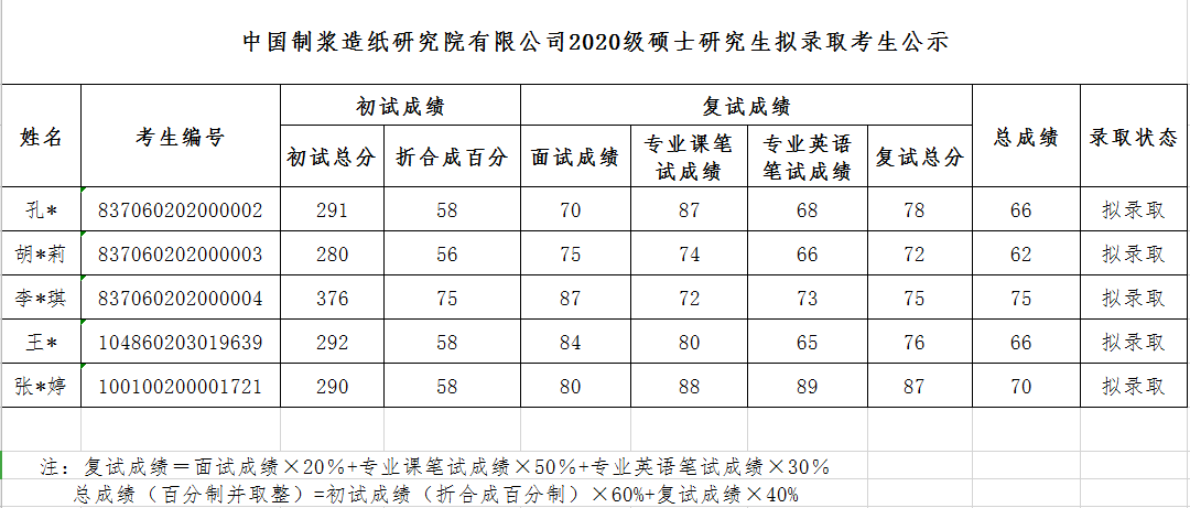 中國(guó)制漿造紙研究院有限公司2020級(jí)碩士研究生擬錄取考生公示