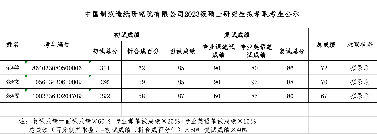中國制漿造紙研究院有限公司2023級(jí)碩士研究生擬錄取考生公示